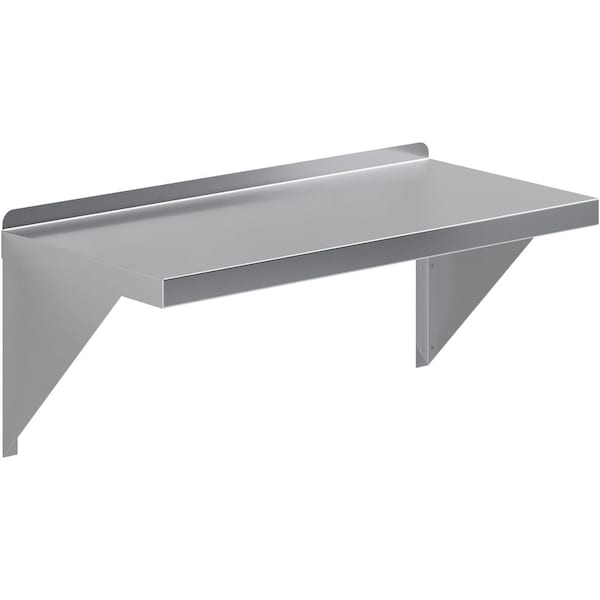 14 in. x 30 in. Stainless Steel Wall Shelf with 12 in. High Mounting Brackets and 1 in. backsplash. Squared edge. Enhance your organization and efficiency with the Amgood stainless steel wall mount shelf. Crafted with high-quality stainless steel, this shelf offers durability and sleek aesthetics for any space. Its sturdy construction ensures steadfast support for an array of items, spanning from spices and ingredients to small kitchen appliances and cleaning supplies. , Product Specifications: 18 Gauge 430 Stainless Steel Shelf , 255 Lbs weight capacity, 1 in. backsplash, 2 Stainless Steel Shelf Mounting Brackets, NSF Certified, Sturdy & Easy to Setup, Heavy Duty Common Applications: Shelf For Commercial Kitchen, Appliance Storage For Home Kitchen, Utility Shop, Garage Storage, Laundry Room Storage, Bathroom, Stove Top / Oven Shelf, Closet Setup, Janitors Room, Butcher Shop, Etc NSF certified to meet the strictest standards for public health protection. The industrial-quality manufacturing process meets the highest regulatory requirements for construction, safety, and durability. Ships knocked down.