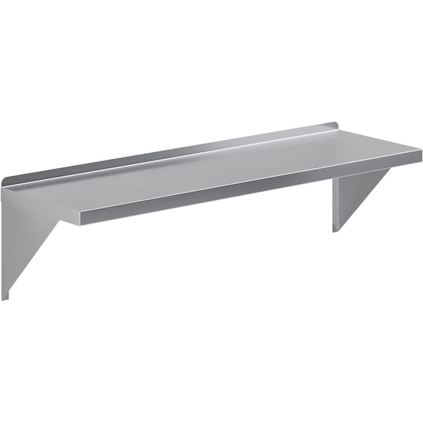 - • 14 in. x 48 in. Stainless Steel Wall Shelf with squared edge and 12 in. High Mounting Brackets. This heavy-duty multifunctional stainless wall shelf is made with 18 gauge stainless steel and can hold up to 305 Lbs of weight. The design features a 1 in. backsplash. It's made with durable welded corners and support brackets.