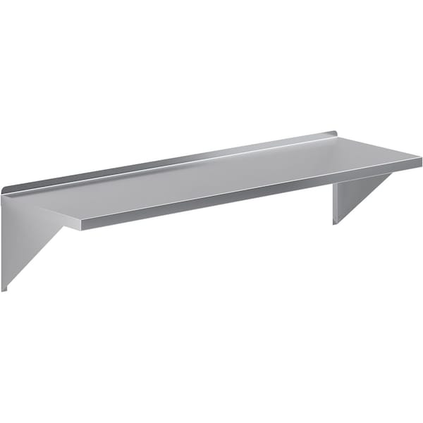- • 18 in. x 60 in. Stainless Steel Wall Shelf with squared edge and 13 in. High Mounting Brackets. This heavy-duty multifunctional stainless wall shelf is made with 18 gauge stainless steel and can hold up to 450 Lbs of weight. The design features a 1 in. backsplash. It's made with durable welded corners and support brackets.