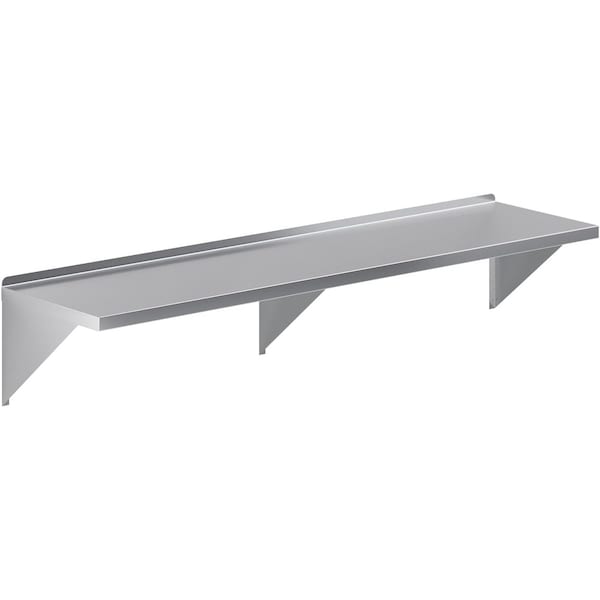 - • 18 in. x 72 in. Stainless Steel Wall Shelf with squared edge and 13 in. High Mounting Brackets. This heavy-duty multifunctional stainless wall shelf is made with 18 gauge stainless steel and can hold up to 450 Lbs of weight. The design features a 1 in. backsplash. It's made with durable welded corners and support brackets.