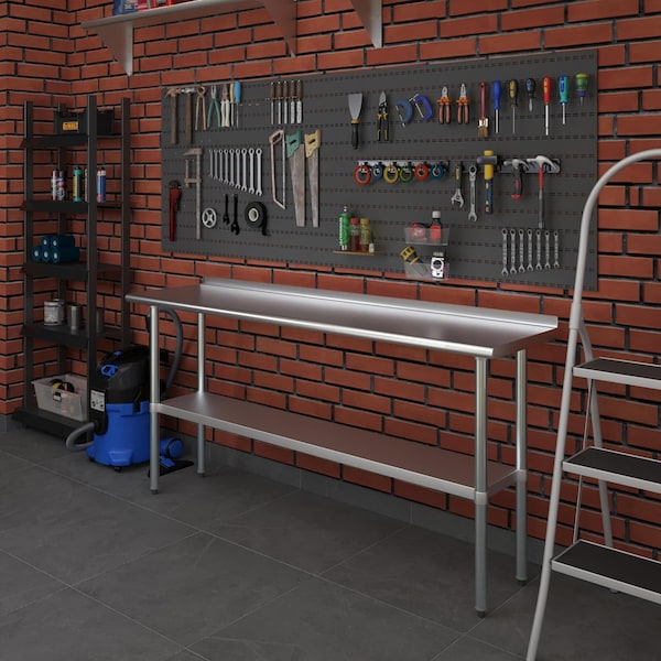 Stainless Steel Work Table With Backsplash and Galvanized Under Shelf, Common Applications: Food Prep Table For Commercial Kitchen, Kitchen Island, Counter Extension, Utility Bench for Shop, Professional Work Station, Garage Work Bench, Laundry Clothes Folding Table, Brewing Setup, Exam Table For Veterinarians, Butcher Shop, Product Specifications, Stainless steel work table surface has curved edges for safety and comfort. It incorporates a heavy duty adjustable galvanized bottom shelf and leveling feet. 18 Gauge 430 Stainless Steel Top, Galvanized Adjustable bottom shelf, Adjustable feet to compensate for uneven floor, Adjustable under shelf-great for storage, Height: 35 in. NSF Certified, Sturdy & easy to setup, Heavy Duty
