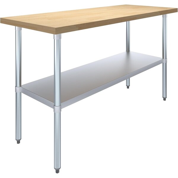 Transform your restaurant, home kitchen, garage or any space with the exceptional AmGood 24 in. x 60 in. Wood Top Work Table. This versatile table, featuring a galvanized base and adjustable undershelf, is not only perfect for a variety of food service tasks in restaurants but also finds its place in home kitchens and other applications. Crafted with a durable galvanized steel base and a sturdy 1 1/2 in. thick top made from North American hard rock maple wood, this work table guarantees longevity and reliability, making it suitable for diverse environments. The maple wood surface, renowned for its durability, serves as an excellent food preparation area while preserving the sharpness of your knives. Experience convenience with the adjustable undershelf, allowing you to store supplies, small appliances, and tools within arm's reach. The table's adjustable 1 in. bullet feet ensure precise leveling, accommodating uneven surfaces with ease. Whether you need to chop vegetables, roll handmade pasta, work with dough, or tackle various other tasks in your kitchen, workbench, or any other setting, this versatile work table is designed to meet your needs. Please note. the table ships knocked down. Assemble and install with no effort. No additional tool or kit is needed. Everything you need is included.A Maple Wood Top Work Table is a great addition to any home or business. It is perfect for a variety of tasks, including a workbench, prep table, or general-purpose table. The included bottom shelf provides additional storage space. Some assembly is required.Common Applications:Food Prep Table For Commercial KitchenKitchen IslandCounter ExtensionUtility Bench for ShopProfessional Work StationGarage Work BenchLaundry Clothes Folding Table Brewing SetupButcher Shop