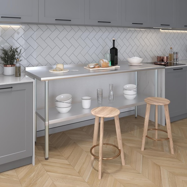 Stainless Steel Work Table With Backsplash and Galvanized Under Shelf, Common Applications: Food Prep Table For Commercial Kitchen, Kitchen Island, Counter Extension, Utility Bench for Shop, Professional Work Station, Garage Work Bench, Laundry Clothes Folding Table, Brewing Setup, Exam Table For Veterinarians, Butcher Shop, Product Specifications, Stainless steel work table surface has curved edges for safety and comfort. It incorporates a heavy duty adjustable galvanized bottom shelf and leveling feet. 18 Gauge 430 Stainless Steel Top, Galvanized Adjustable bottom shelf, Adjustable feet to compensate for uneven floor, Adjustable under shelf-great for storage, Height: 35 in. NSF Certified, Sturdy & easy to setup, Heavy Duty