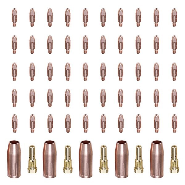 MIG030-60, Professional 60-pieces MIG Torch Consumables, Use for AMICO MIG Welding Machine: MTS-165, MTS-185, MTS-205, MIG-160, MIG-180, MIG-200, MIG-140GS, MIG-200GS, MTS-200DP, MTS-250DP and MIG15200 (MIG Torch Gun). Tip: The tip is made of high-quality #59 Copper, which is resistant to high temperature, corrosion, and has strong thermal and electrical conductivity. This ensures that the current is evenly transmitted throughout the wire at all times. The smooth center hole has low resistance, which reduces the friction during wire feeding, making wire feeding more stable. Diffuser: The diffuser is made of high-quality professional grade brass, which makes it extremely durable. The scientific production technology behind the diffuser makes welding easier and efficient. When replacing the wire reel, the tip does not have to be removed; the welding wire can be passed out directly. Nozzle: The nozzle is made of high-quality #59 Copper. It has excellent strength, provides good protection for the welding torch, and ensures that the protective air flow smooth. This creates a cleaner and more defined weld.