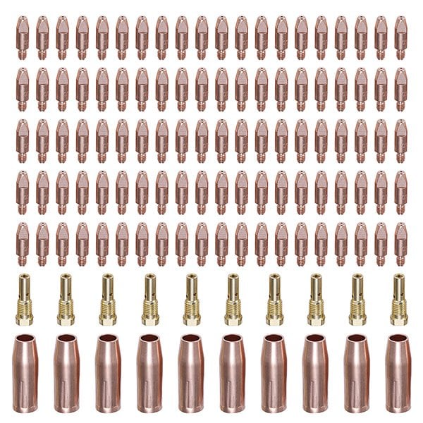 MIG040-120, Professional 120-pieces MIG Torch Consumables, Use for AMICO MIG Welding Machine: MTS-165, MTS-185, MTS-205, MIG-160, MIG-180, MIG-200, MIG-140GS, MIG-200GS, MTS-200DP, MTS-250DP and MIG15200 (MIG Torch Gun). Tip: The tip is made of high-quality #59 Copper, which is resistant to high temperature, corrosion, and has strong thermal and electrical conductivity. This ensures that the current is evenly transmitted throughout the wire at all times. The smooth center hole has low resistance, which reduces the friction during wire feeding, making wire feeding more stable. Diffuser: The diffuser is made of high-quality professional grade brass, which makes it extremely durable. The scientific production technology behind the diffuser makes welding easier and efficient. When replacing the wire reel, the tip does not have to be removed; the welding wire can be passed out directly. Nozzle: The nozzle is made of high-quality #59 Copper. It has excellent strength, provides good protection for the welding torch, and ensures that the protective air flow smooth. This creates a cleaner and more defined weld.