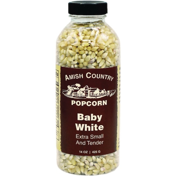 A top seller here at Amish Country Popcorn Baby White Popcorn is hulless crispy small and very white. Baby White is similar to Medium White Popcorn with smaller kernels.