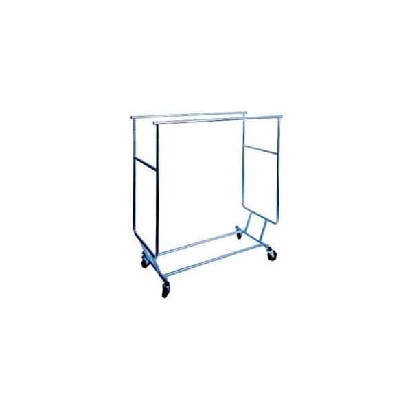 COLLAPSIBLE ROLLING GARMENT RACK RCS-3 W/ DOUBLE RAIL ROUND TUBING - CHROME - RCS/3 MADE OF 1" ROUND TUBING. 48" DOUBLE HANGRAIL EACH WITH TWO 12" PULL-OUT RODS. HEIGHT IS ADJUSTABLE AT 55", 60" AND 65". HAS 4" BALL BEARING CASTERS. INCLUDES CLIPS FOR HANGRAIL STORAGE AND PROTECTIVE RUBBER BUMPERS. COLLAPSIBLE.