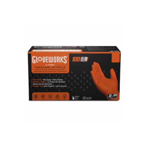 Gloveworks, 100 Count, Medium, Orange, Heavy Duty Nitrile Gloves, High Visibility Orange Color Stands Out Enhances Safety, Raised Diamond Texture For Incredible Grip, Dexterity Of A 7 Mil Glove, Durability Of A 10 Mil Glove, Excellent Chemical Resistance From Common Chemicals, Like Pesticides Many Other Specialty Chemicals, Such As Iodine, Brake Fluid Or Butane, Powder Free For Working With Sticky Adhesives Or Wet Paint So That No Residue From Your Gloves Can Get In The Way Of A Perfect Finish, Inside Features A Polymer Coating, Which Makes It Easy To Put On Or Remove When You Need A Fresh Pair, Commonly Used For Automotive, Manufacturing, Janitorial, Plumbing, Paint Shops, Heavy Duty Industrial Applications