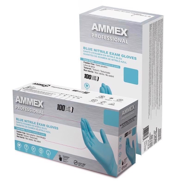Brand Name: Ammex Color: Blue Material: Nitrile Number in Package: 100 Powder/Powder Free: Powder Free Product Type: Disposable Exam Gloves Size: Small Sub Brand: Professional Cuff Type: Beaded Texture: Micro-Roughened Finish: Polymer Coated Length: 9-1/2 in. Grade: Exam Thickness Palm: 3 Dim