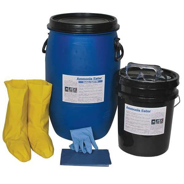 Spill Kit, Fluids Absorbed Ammonia, Neutralizes Chemical Type Ammonia, Volume Absorbed Per Kit 15 gal, Container Type Bucket, 5 gal Container Capacity, 16 in W x 16 in L x 25 in H Container Size, Blue, Filled, Sorbents Included (1) Ammonia Eater, PPE Included (2) Aprons, (2) Pair of Gloves, (2) Pairs HazMat Boots, Additional Components Included Instructions, SDS, Spill Eater Catalog, Tape, Lockable No, UN Rating Not Applicable, NSF Rating Not Rated, Static Dissipative No, UV Resistant No
