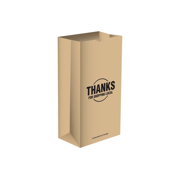 Unbranded 500 count pack 20 lb. self opening sack style SOS paper bag. Made of 40 lb. natural kraft paper stock and printed with 1 color black ink Thanks For Shopping Local on both sides. Measures 8.375 in. Wide x 6.125 in. side gusset x 13.75 in. Tall. This bag is made of 40% post consumer waste material and is 100% reusable and recyclable.