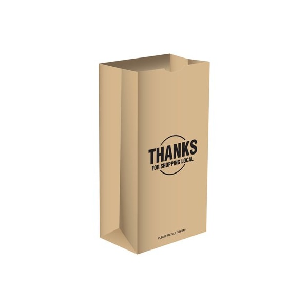 Unbranded 2 lb. self opening sack style paper bag. 1000 count pack. Made of 30 lb. natural kraft paper stock and printed with 1 color black ink Thanks For Shopping Local on the front and lines on the back for writing down parts numbers SKU or pricing. Great check out bag for fasteners keys and other small items. Measures 4.125 Wide x 2.563 side gusset x 8 Tall. This bag is made of 40% post consumer waste material and is 100% reusable and recyclable.