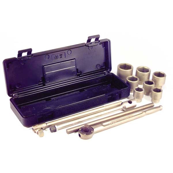 The AMPCO SAFETY TOOLS - W-291M Socket Set comes with eleven pieces including seven sockets, one ratchet (W-140R), one sliding bar (W-256), one extension bar (WE-3/4X16), and one hinged handle wrench (W-257). All these components are neatly packed in a custom form plastic case measuring 5 1/2" in height, 21" in width and having an overall length of 16". This container offers easy organization and portability while protecting your tools when they're not in use. Although this set does not include flex sockets or deep sockets, it does come with drive tools and wrenches adding more utility to your toolbox. Please note that while the socket set itself is tether capable according to ASTM A342 standards and FM approved; individual components like drive tools or sockets may not be tether ready.