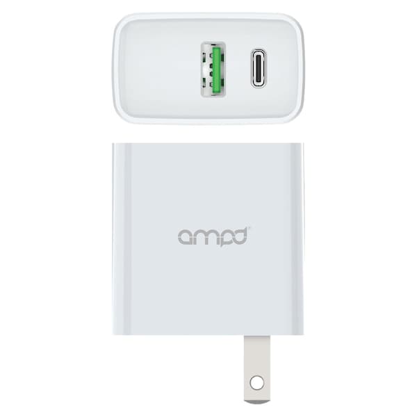 AMPD PD Fast 20W Charger Type C + USB A PortsPortable USB C & A wall charger fit for the latest smartphones or tablets. Dual-port design with USB-C and USB-A, charge two devices at the same time to minimize waiting time and frees you from a cluttered environment. Product Features:20W PD Fast Charging Dual Port Wall ChargerType C & USB-A PortsQuick ChargeDurable Design