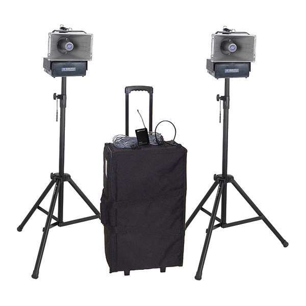 Portable Public Address System,Wireless,50 Watts,Power Requirements 15V,Number of Channels 16,Wireless Range 300 ft.,Frequency Range 584 to 608 MHz,Sound Level Up to 112dB,Inputs 4,Dimensions 32 In. W x 18 In. H x 12 In. D,Standards SW642,Includes Tripods, Case, Speaker
