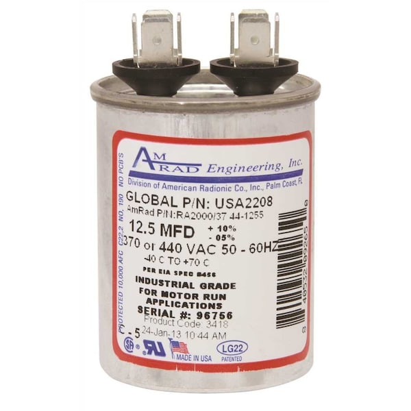 AMRAD USA MADE RUN CAPACITOR12.5 MF 370 440 R2000/37 44-1255 +/-10%