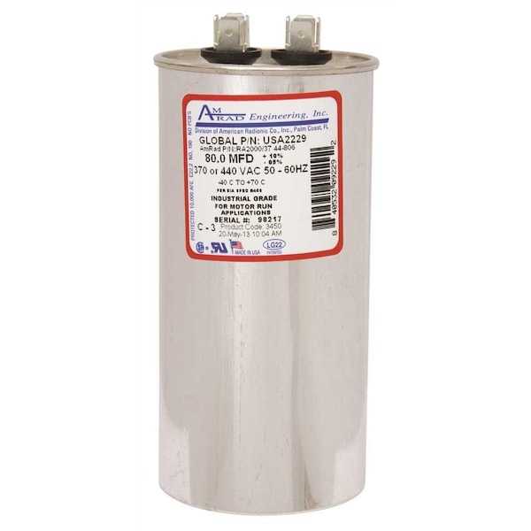 ROUND USA-MADE MOTOR RUN CAPACITOR, 80 MFD, 370/440 VAC