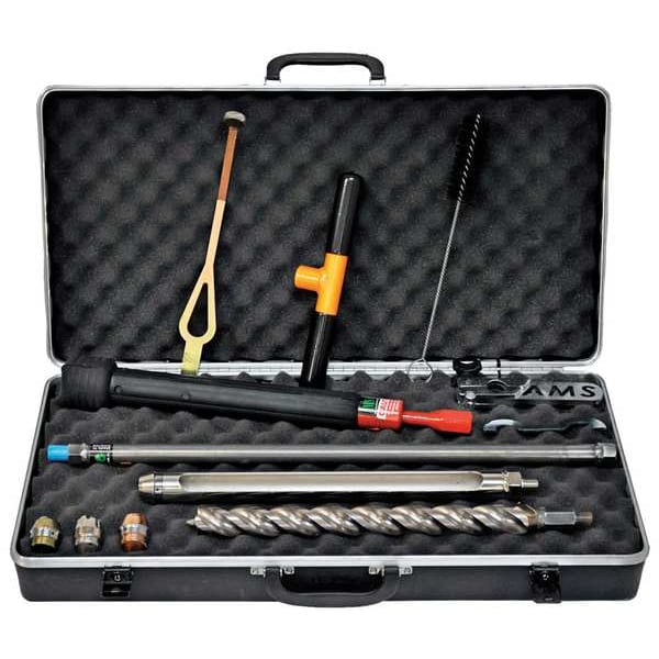Soil Fertility Kit, Dia. (In.) 1 1/4 in, Includes 1 1/2 in X 12 in Nylon Brush, 1 1/2 in X 18 in Triple Lead Flighted Auger, 5/8 in Thread, 1 1/4 in Clay Replaceable Tip, 1 1/4 in Mud Replaceable Tip, 1 1/4 in Serrated Replaceable Tip, 1 1/4 in Standard Oversized Replaceable Tip, 1 1/4 in X 14 in Soil Fertility Probe, 5/8 in Thread, 1 1/8 in Soil Ejector Spoon, 2 ft Extension, 5/8 in Thread, 7/8 in AMS Adjustable Foot Step, Compact Slide Hammer, 5/8 in Thread, Small Equipment Case