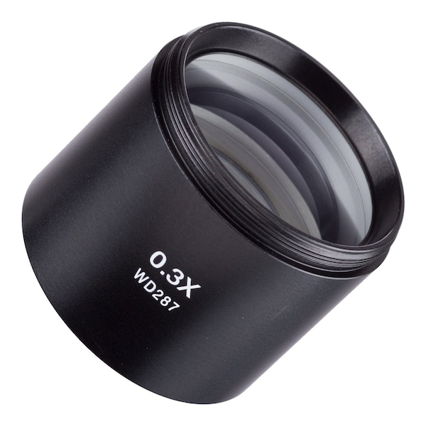 This is a 0.3X Barlow (auxiliary objective) lens for stereo microscopes with 48mm threading. It reduces magnification by 0.7X, and increases the working distance to a maximum of 287mm (11.3in). The mounting thread is 1-7/8" (48mm), designed for AmScope SM and SW series stereo microscopes. Due to the large working-distance, this Barlow lens is only intended for microscopes which support appropriate height-adjustment.
