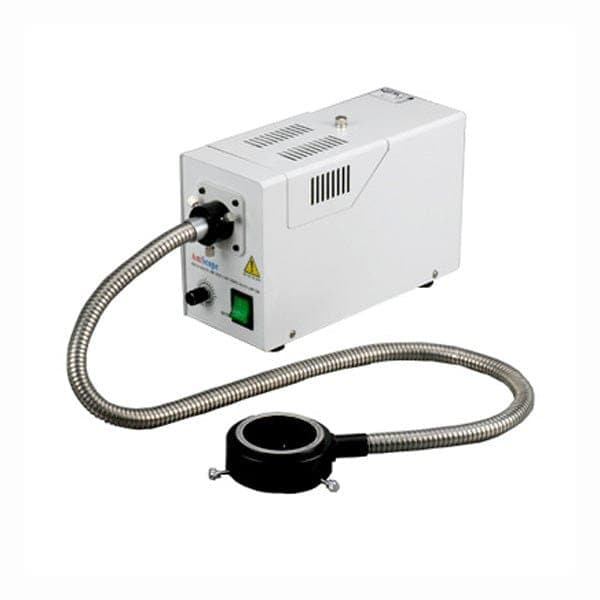 This is a fiber optic ring illuminator in mint condition. Its top window design is convenient for changing bulbs. Its auto-shut-off mechanism will cut off electricity automatically when the window is open. The illuminator comes with a 35" (890mm) metal-sheathed light cable. The ring light is 150Watt with 2-1/8" (56mm) inside diameter and 3-1/8" (80mm) outside diameter. It is fully adjustable in intensity. The light source is a 110V unit with solid-state controls and a two-step, 5/8" and 25/32" (16mm and 20mm in diameter), adaptive hole for the fiber optic cable. This cool high intensity lighting system is excellent for biological and electronic applications.