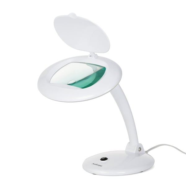 1.75X & 4X Magnification 5in Diameter Lens 56 LED 9W Tabletop Magnifying Lamp. New from AmScope - our new magnifying lamp comes standard with a bright, eye-friendly 9W LED and glass lens that magnifies objects 1.75X larger than the original size. This magnifying lamp is specially designed to provide the best lighting experience without ghost, glare, or flicker helps reduce eye strain, and reveals crystal-clear, true-to-life colors while saving energy with a low power draw. Two points of adjustment on the sturdy metal arm allow you to move the lens closer or farther from the subject. This tabletop lamp fits well in work areas where space is limited. Perfect for electronics manufacturing, manufacturing inspection, soldering, repair work, lab work, studying, writing, reading, etc. Specifications Light Source 56 SMD Surface Mounted Diode LED Lamp Wattage 9W Lumens 650 Color Temperature 6000-7000k Magnification 1.75 Lens Size 6.85"x4.25" Lens Material Glass Lamp Head Dimension 8" x 11" Arm Length 12" Arm Adjust Degrees 30-90° Base Dimensions 9.45" x 7.87" Max Distance From Light Source to Surface 15" Dimmable No Power Source Plug in Wall Outlet Voltage AC 110-120V 60Hz Weight 7 lb. Package Dimension 17.64"L x 7.9"W x 12.2"H Color White Quick Installation Guide/Product Manual Included Certifications CE, RoHS What's Included? Magnifying Lamp w/ Base User Manual