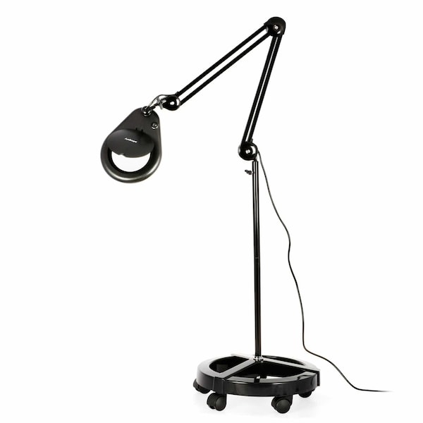 1.75X Magnification 5in Diameter Lens 56 LED 9W Magnifying Lamp with Rolling Floor Stand in Black. New from AmScope - our new magnifying lamp comes standard with a bright, eye-friendly 9W LED and glass lens that magnifies objects 1.75X larger than the original size. This magnifying lamp is specially designed to provide the best lighting experience without ghost, glare, or flicker helps reduce eye strain, and reveals crystal-clear, true-to-life colors while saving energy with a low power draw. Three points of adjustment on the sturdy metal arm allow you to lock the lamp head at any position as needed. Comes with both a rolling floor stand and a surface clamp to allow for optimal placement and mobility within your workspace. Perfect for electronics manufacturing, manufacturing inspection, soldering, repair work, lab work, medical and dental offices, studying, writing, reading, etc. Specifications: Light Source 56 SMD Surface Mounted Diode LED Lamp Wattage 9W Lumens 720 Color Temperature 6000-7000k Magnification 1.75 Lens Size 5" Lens Material Glass Lamp Head Dimension 7.36" x 11.9" Arm Length 2x17" Arm Adjust Degrees 360° Max Distance From Light Source to Surface 60" Stand Height 64.5" Base Diameter 16" Dimmable No Power Source Plug in Wall Outlet Voltage AC 110-120V 60Hz Weight 8 lb. Package Dimension 21.5"L*19.5"W x 14"H Color Black Quick Installation Guide/Product Manual Included Certifications CE, RoHS What's Included? Magnifying Lamp Rolling Floor Stand Surface Clamp User Manual