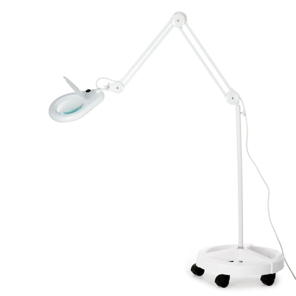 1.75X Magnification 5in Diameter Lens 56 LED 9W Magnifying Lamp with Rolling Floor Stand in White. New from AmScope - our new magnifying lamp comes standard with a bright, eye-friendly 9W LED and glass lens that magnifies objects 1.75X larger than the original size. This magnifying lamp is specially designed to provide the best lighting experience without ghost, glare, or flicker helps reduce eye strain, and reveals crystal-clear, true-to-life colors while saving energy with a low power draw. Three points of adjustment on the sturdy metal arm allow you to lock the lamp head at any position as needed. Comes with both a rolling floor stand and a surface clamp to allow for optimal placement and mobility within your workspace. Perfect for electronics manufacturing, manufacturing inspection, soldering, repair work, lab work, medical and dental offices, studying, writing, reading, etc. Specifications: Light Source 56 SMD Surface Mounted Diode LED Lamp Wattage 9W Lumens 720 Color Temperature 6000-7000k Magnification 1.75 Lens Size 5" Lens Material Glass Lamp Head Dimension 7.36" x 11.9" Arm Length 2x17" Arm Adjust Degrees 360° Max Distance From Light Source to Surface 60" Stand Height 64.5" Base Diameter 16" Dimmable No Power Source Plug in Wall Outlet Voltage AC 110-120V 60Hz Weight 8 lb. Package Dimension 21.5"L*19.5"W x 14"H Color White Quick Installation Guide/Product Manual Included Certifications CE, RoHS What's Included? Magnifying Lamp Rolling Floor Stand Surface Clamp User Manual