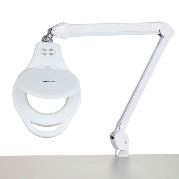 1.75X Magnification 5in Diameter Lens 96 LED 10W Desk Clamp Magnifying Lamp. New from AmScope - our new magnifying lamp comes standard with a bright, eye-friendly 10W LED and glass lens that magnifies objects 1.75X larger than the original size. This magnifying lamp is specially designed to provide the best lighting experience without ghost, glare, or flicker helps reduce eye strain, and reveals crystal-clear, true-to-life colors while saving energy with a low power draw. Three points of adjustment on the sturdy metal arm allow you to lock the lamp head at any position as needed. The control panel, located on the lens head, includes the on/off switch as well as buttons that allow you to dim or brighten the light for your preferred brightness. Perfect for electronics manufacturing, manufacturing inspection, soldering, repair work, lab work, studying, writing, reading, etc. Specifications Light Source 96 SMD Surface Mounted Diode LED Lamp Wattage 10W Lumens 550 Color Temperature 6000-7000k Magnification 1.75 Lens Size 5" Lens Material Glass Lamp Head Dimension 12.6" x 8.4" Arm Length 2x17" Arm Adjust Degrees 360° Max Distance From Light Source to Surface 30" Dimmable Yes Clamp Distance 2.56" Power Source Plug in Wall Outlet Voltage AC 110-120V 60Hz Weight 8 lb. Package Dimension 14.57" L x 4.13" W x 20.47" H Color Multi-Toned White Quick Installation Guide/Product Manual Included Certifications CE, RoHS What's Included? Magnifying Lamp Surface Clamp User Manual