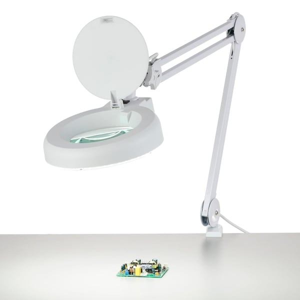 2.25X Magnification 5in Diameter Lens 90 LED Desk Clamp Magnifying Lamp. New from AmScope - our new magnifying lamp comes standard with a bright, eye-friendly 18W LED and glass lens that magnifies objects 2.25X larger than the original size. This magnifying lamp is specially designed to provide the best lighting experience without ghost, glare, or flicker helps reduce eye strain, and reveals crystal-clear, true-to-life colors while saving energy with a low power draw. Three points of adjustment on the sturdy metal arm allow you to lock the lamp head at any position as needed. Comes with a surface clamp to allow for optimal placement and mobility within your workspace. Perfect for electronics manufacturing, manufacturing inspection, soldering, repair work, lab work, medical and dental offices, studying, writing, reading, etc. Specifications: Light Source 90 SMD Surface Mounted Diode LED Lamp Wattage 18W Lumens 1250 Color Temperature 6000-7000k Magnification 2.25 Lens Size 5" Lens Material Glass Lamp Head Dimension 11.25" x 8" x 2.2" Arm Length 17" x 2 Arm Adjust Degrees 360° Max Distance From Light Source to Surface 27" Dimmable No Power Source Plug in Wall Outlet Voltage AC 110-120V 60Hz Weight 8 lb. Package Dimension 24.25" x 10.75" x 6.75" Color White Quick Installation Guide/Product Manual Download Certifications CE, RoHS What's Included? Magnifying Lamp Surface Clamp