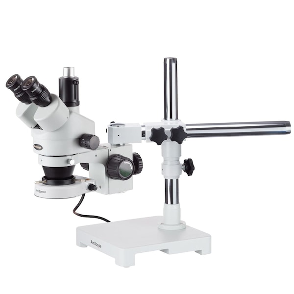 This 3.5X-45X trinocular stereo zoom microscope is on boom Stand. It comes with a trinocular head with super widefield optics, a heavy-duty Single-Arm boom Stand, a 54-LED ring light with dimmer, & a 10MP color digital camera. It offers crystal clear erect stereo images, 2-1/2" (65mm) super widefield of view, 13:1 large magnification zoom range & 8" (200mm) large working distance. The high-eyepoint optical design ensures an easy & comfortable observation for all users including eyeglass wearers.