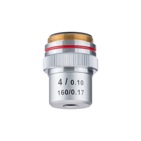 This is a 4X achromatic objective lens for DIN-standard microscopes. Intended primarily for biological applications, it is designed to work with microscopes using 160mm tube-length and 45mm parfocal distance. Achromatic correction provides improved color accuracy and resolution.