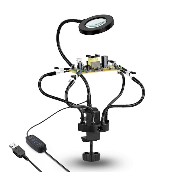 5X Magnification Dual Gooseneck 42 LED Magnifying Lamp with Circuit Board Holders and Table Clamp. A useful magnifying lamp with a 5X magnifying lens and 42 SMD LED illuminating lights, it can be widely applied to reading, observing, close work craft, carving, soldering, electronic welding, modeling, embroidery, biological observation, etc. The support clamps and alligator clips are adjustable. An ideal tool when a third hand is required. The base surface is padded with a steel sheet to increase base weight and reinforce stability. Smooth Dimming: 3 Color Modes with 10 brightness level settings. Specification: Light Source 42pcs SMD Surface Mounted Diode LED Lamp Head Dimension 3.74" Lamp Base Dimension 3.7" x 4" Arm Length 15.74" Arm Adjust Degrees 360° Magnification 5X Lens Diameter 2.16" Max Distance from Light Source to Surface 19" Dimmable Yes, Dimmer on the Cable Power Source USB Cable Voltage 5V 2A Clamp Distance 2.76" Wattage 8W Lumens 210lm Color Temperature 2982K Weight 2.32LB Package Dimension 11.02" x 3.74" x 2.76" Color Black Certifications CE, ROHS What's Included? One Magnifying Gooseneck Lamp One Desk Clamp Four Bendable Arms One Arm Mounting Block One Bag of Hardware and Tools One Microfiber Cleaning Cloth Manual download