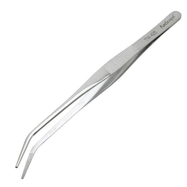 General purpose, ideal for use in laboratories and schools. Made of stainless steel, these curved tip, 6-1/2 in. utility tweezers are ideal for bending, separating and removing small items.