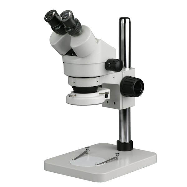 The optics of this SM series microscope features a large zoom magnification range, which produces sharp, crystal-clear stereo images, while providing a generous working distance. The 360 degree swiveling, binocular head is attached at a 45 degree angle, which ensures easy & comfortable observation - especially when used in conjunction with the included rubber eyeguards. Also included is our taller 14" pillar Stand, allowing you to easily view taller samples & use high working distance, low magnification settings as well.