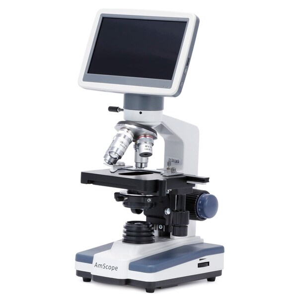 B120 Series Student & Professional LED Binocular Compound Microscope LED w/ 7in Digital Display Camera Head. The B120 binocular compound microscope is designed for teaching demonstrations, clinical examinations, and laboratory applications. It is an ideal microscope for teachers and students, including those in medical school or with a major in biology. It has a number of advancements in functionality compared to other microscopes in its class, such as enhanced LED lighting, centerable condenser, and Siedentopf head adjustments. Use the microscope for studying fixed or live cells, bacteria, plants, and soil, or water samples. This bundle also includes a digital microscope head that replaces the original binocular head and allows for viewing live microscopic images on a 7" IPS display. Digital Microscope Head Adding a video screen to your microscope is easier than ever. Our DMH video system combines monitor and camera into a single device that attaches directly to your microscope. Now you can see microscopic details right on the screen. Compatible with our most popular compound microscopes such as the B120 and B270. The DMH-18070 has a compact, lightweight design that can be used with any compound microscope with a minimum 42mm mount. The 7" screen offers essential brightness, contrast, and saturation controls. The built-in camera produces sharp images with a high framerate for super smooth, no-lag video. The DMH mounts to the microscopes turret in place of the default monocular, binocular, or trinocular head. Viewing Head The eyepiece spacing can be easily adjusted using a precision Siedentopf mechanism to customize the microscope to your viewing comfort. A diopter is available on the left ocular tube to compensate for asymmetry, and the ocular tubes are angled at 30° to comfortably accommodate a seated position without neck strain. Various eyepieces can be used to increase the overall optical magnification. Optics The objective turret provides instant access to 4 magnification levels to easily focus in on minute details from 40X to 1000X. This covers the magnifications needed for studying hair follicles, cells, and bacteria. These high-quality lenses are achromatically corrected to improve resolution and color accuracy. Optional eyepieces are available to modify the compound magnification, providing levels up to 2500X. The Stage The 2-layer mechanical stage provides smooth and precise movement to examine specimen slides. The stage's low-position contr