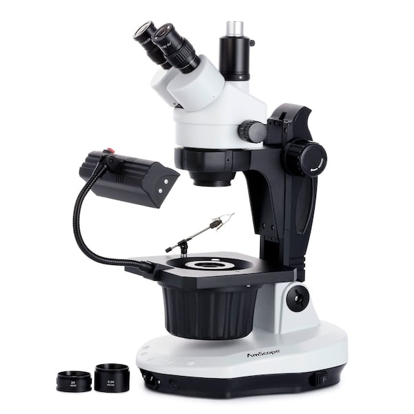 GM400 Series Advanced Jewel Gem Zoom Trinocular Stereo Microscope 3.5X-90X Magnification on Track Stand. This high quality microscope is designed for professional jewelers and gemologists. It includes a 3.5X-90X super widefield zoom stereo microscope head, 3D jewelry/gem clamp tweezers, rotatable round stage with darkfield iris condenser and professional GEM stand. It offers 8" 200mm working distance, 2-1/2" 65mm super wide field of view and 26:1 large zoom magnification range. The microscope is illuminated with a 30W darkfield halogen light built in to the base and a 7W gooseneck rectangular fluorescent incident light box, providing rich spectrum, high-temperature color and close-to-daylight illumination. The incident light box shines light down onto objects, used to observe the surface details and fine structures of jewels or gemstones. The transmitted light through the darkfield condenser is designed for the examination of the inside quality of diamonds. This microscope is manufactured under the strict guidelines established under ISO 9001:2000 Standards. Features: A high quality professional 3.5X-90X trinocular jewelry/gem microscope with rotatable darkfield stage A right microscope for distinguishing genuine & imitation gems and judging production origin Comfortable Ergonomic design High resolution sharp images with both bright and dark field illumination Large rotatable round stage with built-in darkfield condenser, 3D gem clamp and graduations Adjustable stand for easy and comfortable observation Possible to measure gem angles Advanced halogen system providing rich spectrum, high-temperature color, and close-to-daylight illumination Flexible gooseneck-supported rectangular incident top fluorescent lamp Bright halogen bottom light with dimmer for best darkfield illumination Built-in darkfield condenser with iris 3D flexible gem clamp 45 degree inclined 360 degree rotatable trinocular head Trinocular port for adding photo or video capability Large zoom magnification range High resolution optics with great flatness and contrast Sharp stereo erect images over a wide field view Crystal clear original true color images Eye tube with adjustable diopter Accurate alignment ensuring a fatigue-free viewing Full optical glass elements Precise ground glass lenses All metal mechanical components Adjustable interpupillary distance Rubber eye-guards included Manufactured under restrict ISO 9001 quality control system for microscope Specifications: Head
