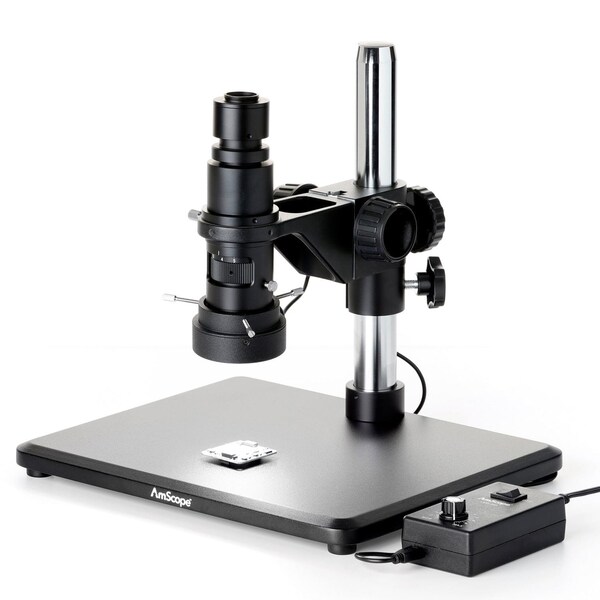 H800 Zoom Inspection Stereo Microscope 0.7X-5X Magnification with 96-LED Ring Light + 1080P 2MP HDMI Auto-focus Camera. The H800 is designed specifically for photomicrography, providing 0.7X-5X zoom magnification and a C-mount interface for most professional microscope cameras. While stereo microscopes are the preferred choice for low-magnification work like micro-soldering and dissection, the stereo lens design is not optimal for producing accurate photos or videos due to off-axis, angular distortion and keystoning. This single-lens microscope provides the same magnification range, but without the distortion. The 0.7X-5X zoom objective lens produces exceptionally sharp images throughout the entire range. The C-mount camera interface is height-adjustable, allowing precise parfocal adjustments to keep the lens in focus throughout the zoom range. The microscope has an integrated 0.4X reduction element optimized for cameras using 1/2" format sensors, providing more field-of-view. An optional adapter is available AD-C23 to convert the C-mount interface into a 30mm or 23mm tube which can be used with eyepieces or camera reduction lenses. If you choose to use this microscope with an eyepiece or one of our 23mm DSLR adapters, this optional adapter is exactly what you would need. This package includes a table-stand with an 11" pillar and a focusing block. The focusing block uses a model-specific collar for mounting the lens, and symmetrical, tension-adjustable coarse focus knobs. The large base provides ample working area and stability. This model includes a 96-LED ring-light to provide bright, even lighting. The light intensity is controlled by a power module with a simple, single-knob design which can cover a large range of brightness. This microscope comes with a cutting-edge auto-focus camera designed specifically for microscopy. It offers 1080p live-viewing over HDMI, and can record 2MP photos and video directly to Secure Digital media. The internal software provides control over exposure and color, and tools for measurements and comparisons. The addition of auto-focus limits the need to make focus-adjustments when using the camera as the primary means of observation. Connected to an HDMI monitor or TV, 1080p live video can be viewed at a super-smooth 60fps. The included USB mouse allows you to control the camera through its easy-to-use interface. As an alternative solution, connect to the camera over WiFi for remote software control, with 25fps streamin
