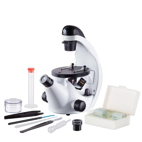 IQCrew by IN50 Science Discovery Series Inverted Compound Microscope 40X-500X Magnification with 10pc Slides. A great, easy-to-use microscope for kids & young adults! IQCrews Science Discovery Series is designed to inspire kids to learn more about science. Microscopes are important tools which help children understand science and nature by allowing them to peek into the microscopic world, which is why they are a standard component of STEM curricula. Biology, Chemistry, Geology, and many more fields rely on microscopes to understand how things work. Magnifications: 40X, 100X, and 200X! The high-quality lenses provide true optical magnification, from 40X to 200X. The standard interchangeable eyepieces allow for an even wider range of magnifications. Uniform Pattern with LED Illumination The built-in illumination can create very interesting effects, such as dark-field or oblique lighting.The low-heat LED light is safe, long-lasting, and durable. Dual usage with slides and liquids Our new inverted design provides a big advantage over conventional microscopes, by allowing both traditional specimen slides and liquids to be used. Hands-on experiment for your budding scientist! In the Frost Crystals Experiment included in the manual, kids can observe commonly used Epson Salt grow crystals. Detailed instructions and step-by-step instructions lead the way as your child gains valuable hands-on experience in the scientific method, visual analysis, note-taking, scientific procedure and more. They could even share their results at the school science fair! IQCrew's Science Discovery Series is designed to inspire kids to learn more about science. Microscopes are important tools which help children understand science and nature by allowing them to peek into the microscopic world, which is why they are a standard component of STEM curricula. Biology, chemistry, geology, and many more fields rely on microscopes to understand how things work. Our new inverted design provides a big advantage over conventional microscopes, by allowing both traditional specimen slides and liquids to be used. By moving the microscope's lenses under the specimen stage, there's plenty room on top. A Petri dish can be used to hold liquid samples like pond water, hatching brine shrimp, or growing crystals. The inverted design also lets you adjust the focus without moving the stage, which could disturb the specimen. How close up do you want to see things? The IN50C includes 2 eyepieces, and has 5