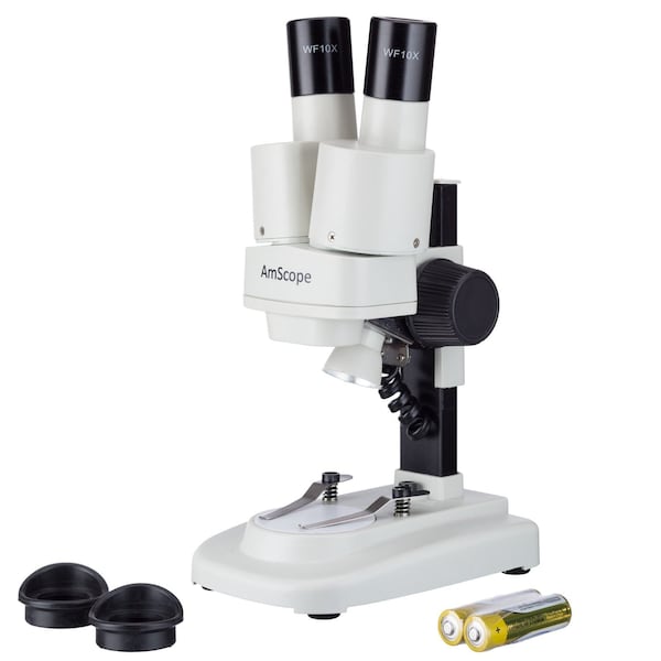 IQCrew by SE100 Series Kid's Portable Battery-Powered Binocular Stereo Microscope 10X-20X Magnification with LED Light. This is a brand new cordless LED binocular stereo microscope for students. It provides 10X & 20X magnification power, coming with two pairs of optical glass widefield eyepieces, 5X & 10X, and two AA batteries. It is an ideal instrument for viewing collections of coins, stamps, meteorites, tektites, minerals, gems, fossils, or insects. It is a perfect tool for inspecting jewelry, watches, circuit board, biological specimens, dissection, and etc. Features: Fully Coated Optical System Sharp 3-D Image with High Resolution Built-in Upper Illumination System Superior Instrument Easy to Operate Two Pairs of Eyepieces Included Manufactured under ISO 9001 Quality Control Standard Excellent Specifications: Head: upright binocular Objectives: 2X Magnification: 20X Eyepiece: wide field - WF5X, WF10X Stage: white plate Interpupillary Distance: 55 - 75mm Working Distance: 2-3/4" 70mm Illumination: 1W LED bulb Shipping Weight: 3 lbs Packing List : One Monocular Microscope with Track Stand One Widefield 5X Eyepiece One Widefield 10X Eyepiece One White Stage Plate One Dust Cover User's Manual Download Shipping Weight: 3 lbs