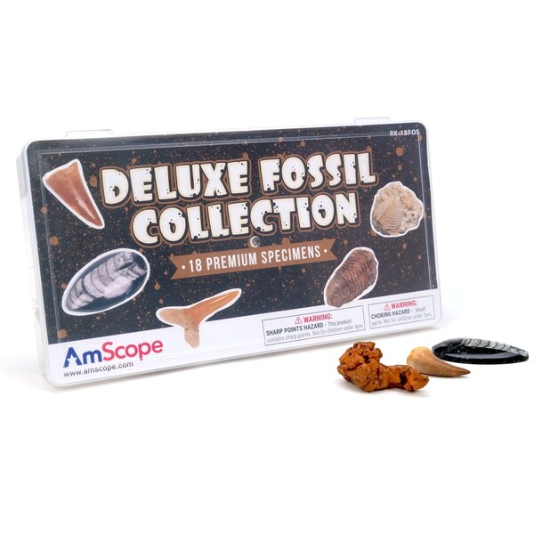 Kid's Deluxe Fossil Collection w/18 Unique Specimens and Full Color Identification Card. Fossils have been studied by professional and amateur scientists all over the world for hundreds of years. Now - with our 18 pc Deluxe Fossil Collection - exclusively from AmScope - your child can begin their exploration too! The fossil collection contains 18 different specimens of plants and animals. Your child will be amazed at the amazing designs of the fossils and the intricate features they can observe when they view the specimens with our stereo microscopes! Features: 18 authentic fossils hand selected for their color, texture, and beauty. Perfect for study and fun. Collector Box/ Display Case is perfect for keeping all your fossils organized and portable. The collection contains: Corpolite Trilobite Polished Orthocereas Sand Dollar Coral Enchodus Tooth Ray Teeth Bracheopods Clam Otodus Shark Tooth Sand Tiger Shark Tooth Mosasaur Tooth Crinoid Sea Urchin Atrypa Sahara Gastropod Pink Gastropod Shark Vertebrae <li>CHOKING HAZARD -- Small parts. Not for children under 3-yrs.</li>
