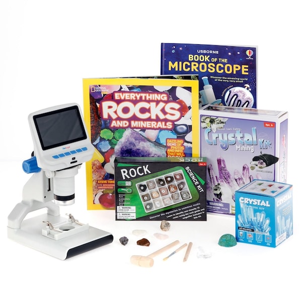 Kid's Natural Gemstone Discoverer Series Set featuring 1080P HD Portable LCD Digital Color Microscope, Ultimate Natural Gemstone Activity Set and more. Adult supervision is required for all experiments and activities. Recommended for children ages 10+ What's Included? 4.3inch Digital MicroscopeWireless RemoteMicroscope StandSlide HolderPower CableData CableNatural Gemstone Exploration Kit with Clay Block with 5 natural gemstones, Wooden Mallet, Chisel, Dust Brush, Pouch, MagnifierRocks and Minerals Book by National Geographic KidsGrow Your Own Crystal KitWorld of Microscope Book15-Piece Rock Collection