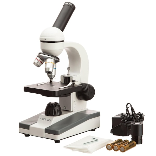 M148 Series Biological Science Student Monocular Compound Microscope 40X-1000X Magnification with 25 Biology Slide Collection. This is a perfect package of a high power microscope with a 25pc prepared slide collection for students to learn science. It comes with full optical glass elements, metal framework, 360 degree rotatable monocular head, and LED illumination. It offers five magnification settings, 40X, 100X, 250X, 400X and 1000X. The LED illumination system uses either an outlet adapter included or three AA batteries or re-chargeable batteries. The 25-piece slide set includes assorted specimens of plants, insects and animal tissues. This is an ideal microscopy package for home school or for students from elementary to high school. It is also an excellent instrument for hobbyists. Features : A Great Affordable High Power Student Microscope with Sturdy Metal Framework and Optical Glass Lenses 45 Degree Inclined 360 Degree Swiveling Monocular Head with Locked-in Eyepiece Built-In Contemporary LED Illumination Plain Stage with Clips and Stain Resistant Finish Fully Coated Optical System High Resolution Offering Sharp Images Five Levels of Magnification: 40X, 100X, 250X, 400X and 1000X Single Lens Condenser and Disc Diaphragm Focusing Control Knobs on Both Sides Full Optical Glass Elements Precise Ground Glass Lens All Metal Mechanical Components Solid Metal Frame with Stain Resistant Enamel Finish Five blank slides Five prepared slides: pine stem, sunflower stem, onion epidermis, cotton stem and house fly leg Manufactured under ISO 9001 Quality Control Standard Excellent Specifications : Head: 45 degree inclined monocular Eyepiece: WF10X & 25X Objectives: 4X, 10X, 40X Condenser: single lens with disc diaphragm Stage Dimensions: 3-1/2" x 3-1/2" Illumination: LED Power Supply: 110V/60Hz adapter included or 3 AA batteries not included Packing List : One Monocular Microscope with Three Objectives One WF10X Eyepiece One 25X Eyepiece One Dust Cover Two Clips User's Manual Download 25 PC Prepared Slide Set Shipping Weight: 6 lbs