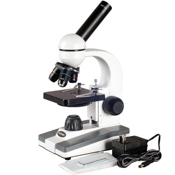M148 Series Biological Science Student Monocular Compound Microscope 40X-640X Magnification. This is a perfect microscope for students to learn science, offering six magnification settings, 40X, 64X, 100X, 160X, 400X and 640X. It comes with full optical glass elements, metal framework, 360° rotatable monocular head, and the LED illumination system that uses either wall-power adapter included or three AA batteries or re-chargeable batteries. It is an ideal microscope for home school or for students from elementary to high school. It is also an excellent instrument for hobbyists. /p> Features : A Great Affordable High Power Student Microscope for Sciences 45° Inclined 360° Swiveling Monocular Head with Locked-in Eyepiece Built-In Contemporary LED Illumination System Using either Wall-power or Batteries Plain Stage with Clips and Stain Resistant Finish Fully Coated Optical System High Resolution Offering Sharp Images Six Levels of Magnification: 40X, 64X, 100X, 160X, 400X and 640X Single Lens Condenser and Disc Diaphragm Focusing Control Knobs on Both Sides Full Optical Glass Elements Precise Ground Glass Lens All Metal Mechanical Components Solid Metal Frame with Stain Resistant Enamel Finish Manufactured under ISO 9001 Quality Control Standard Excellent Specifications : Head: 45 degree inclined monocular Eyepiece: WF10X & 16X Objectives: 4X, 10X, 40X Condenser: single lens with disc diaphragm Stage Dimensions: 3-1/2" x 3-1/2" Illumination: LED Power Supply: 110V/60Hz adpter included or 3 AA batteries not included Packing List : One Monocular Microscope Three Objectives, 4X, 10X 40X One Widefield 10X Eyepiece One Widefield 16X Eyepiece One Power Adapter One Dust Cover Two Clips User's Manual Download