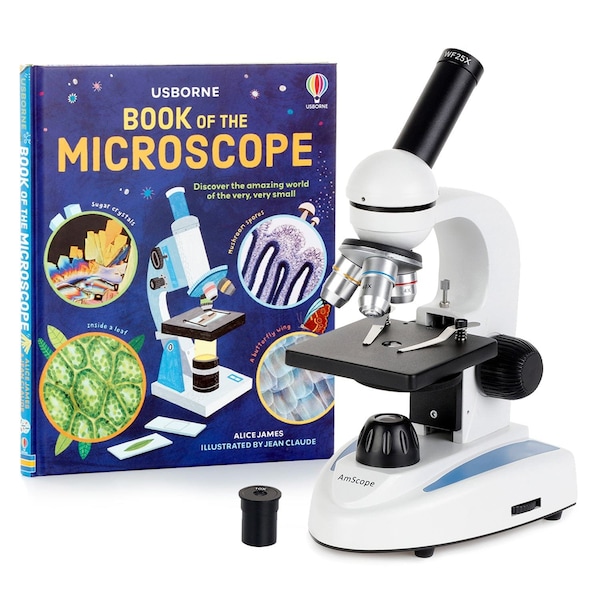 M149 Series Student Kids Metal Frame Glass Optics Biological Moncluar Compound Microscope 40X-1000X Magnification. This microscope comes with the microscope book, Book of The Microscope. The microscope offers five magnification settings, 40X, 100X, 250X, 400X and 1000X. It has optical glass lenses, metal framework, 360 degree rotatable monocular head, and the LED illumination system that uses either a outlet adapter included or three AA batteries. The book investigates the enormous variety of objects too small for the eye to see. Step-by-step diagrams show how to get the best from a microscope and how to make and keep slides. It covers different types of microscopes and there are plenty of exciting suggestions for projects which reveal the incredible detail of everyday objects. This is a great package for home school or for students, from elementary to high school, and hobbyists. Features : A Great Affordable High Power Student Microscope for Sciences 45 Degree Inclined 360 Degree Swiveling Monocular Head with Locked-in Eyepiece Built-In Contemporary LED Illumination System Using either Wall-power or Batteries Plain Stage with Clips and Stain Resistant Finish Fully Coated Optical System High Resolution Offering Sharp Images Five Levels of Magnification: 40X, 100X, 250X, 400X and 1000X Single Lens Condenser and Disc Diaphragm Focusing Control Knobs on Both Sides Full Optical Glass Elements Precise Ground Glass Lens All Metal Mechanical Components Solid Metal Frame with Stain Resistant Enamel Finish Manufactured under ISO 9001 Quality Control Standard Excellent Specifications : Head: 45 degree inclined monocular Eyepiece: WF10X Objectives: 4X, 10X, 40X Condenser: single lens with disc diaphragm Stage Dimensions: 3-1/2" x 3-1/2" Illumination: LED Power Supply: 110V/60Hz adapter included or 3 AA batteries not included Packing List : One Monocular Microscope Three Objectives, 4X, 10X 40X One Widefield 10X Eyepiece One Widefield 25X Eyepiece One Power Adapter One Dust Cover Two Clips User's Manual Download One Microscope Book Shipping Weight: 6 lbs