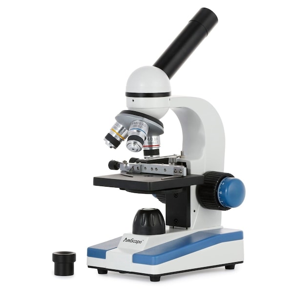 M150 Series Portable LED Monocular Student Compound Microscope 40X-1000X Magnification With Mechanical Stage. This is a perfect microscope for students to learn science. It comes with full optical glass elements, metal framework, 360 degree rotatable monocular head, coarse & fine focusing, mechanical stage, and LED illumination. It offers five magnification settings, 40X, 100X, 250X, 400X and 1000X. It is an ideal microscope for home school or for students from elementary to high school. It is also an excellent instrument for hobbyists. Features: A great affordable high power student microscope with coarse & fine focusing 45 degree inclined 360 degree swiveling monocular head with locked-in eyepiece Mechanical stage for easy control of slide gliding Built-in contemporary led illumination Plain stage with clips and stain resistant finish Fully coated optical system High resolution offering sharp images Five levels of magnification: 40x, 100x, 250x, 400x and 1000x Single lens condenser and disc diaphragm Focusing control knobs on both sides Full optical glass elements Precise ground glass lens All metal mechanical components Solid metal frame with stain resistant enamel finish Manufactured under ISO 9001 quality control standard Excellent Specifications: Head: 45 degree inclined monocular Eyepiece: WF10x & 25x Objectives: 4x, 10x, 40x Condenser: single lens with disc diaphragm Stage: mechanical Stage dimension: 3-1/2" x 3-1/2" Illumination: LED Power Supply: 5V USB or 3 AA batteries not included Packing List: Monocular microscope with three objectives WF10x eyepiece 25x eyepiece Dust cover Clips pair One USB-C Power Cable