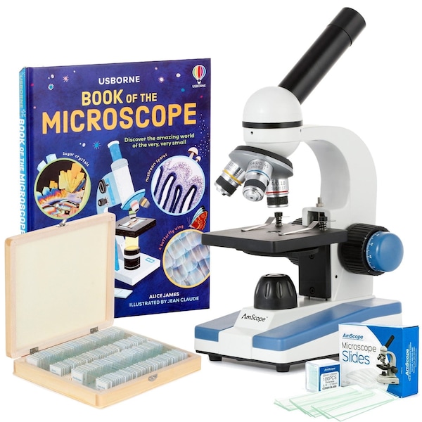 - Includes a collection of 100 prepared biology slides, 50 blank slides, and "The Book of the Microscope" book