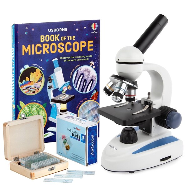 M158 Series Cordless LED Student Compound Microscope 40X-1000X Magnification with Metal Frame, Glass Lenses and Coarse & Fine Focus + 25 Prepared Slides & Book. This advanced microscope package comes with a high power microscope, a 25pc prepared slide collection and the microscope book, "Book of The Microscope". It is a great package for students to learn science. The microscope offers five magnification settings, 40X, 100X, 250X, 400X and 1000X. It has full optical glass elements, metal framework, 360 degree rotatable monocular head, coarse & fine focusing, and the LED illumination system that uses either wall-power adapter included or three AA batteries or re-chargeable batteries. The 25-piece slide set includes assorted specimens of plants, insects and animal tissues. It is an ideal microscope for home school or for students from elementary to high school. It is also an excellent instrument for hobbyists. Features : A Great Affordable High Power Student Microscope with Coarse & Fine Focusing for Learning Sciences 45 Degree Inclined 360 Degree Swiveling Monocular Head with Locked-in Eyepiece Built-In Contemporary LED Illumination System Using either Wall-power or Batteries Plain Stage with Clips and Stain Resistant Finish Fully Coated Optical System High Resolution Offering Sharp Images Five Levels of Magnification: 40X, 100X, 250X, 400X and 1000X Single Lens Condenser and Disc Diaphragm Focusing Control Knobs on Both Sides Full Optical Glass Elements Precise Ground Glass Lens All Metal Mechanical Components Solid Metal Frame with Stain Resistant Enamel Finish Five blank slides Five prepared slides: pine stem, sunflower stem, onion epidermis, cotton stem and house fly leg Manufactured under ISO 9001 Quality Control Standard Excellent Specifications : Head: 45 degree inclined monocular Eyepiece: WF10X and 25X Objective: 4X, 10X and 40X Condenser: single lens with disc diaphragm Stage Dimensions: 3-1/2" x 3-1/2" Illumination: LED Power Supply: 110V/60Hz adapter included or 3 AA batteries not included Packing List : One Monocular Microscope Three Objectives, 4X, 10X 40X One Widefield 10X Eyepiece w/ Pointer One Widefield 25X Eyepiece One Power Adapter One Dust Cover Two Clips User's Manual Download One 25pc Prepared Slide Collection One Microscope Book Shipping Weight: 6 lbs