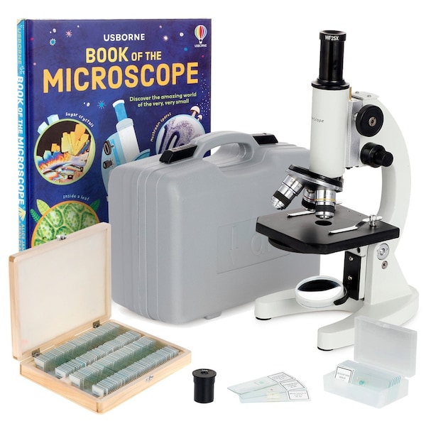 M60 Series Metal Body Glass Lens Biology Student Monocular Compound Microscope 40X-100X Magnification with ABS Case, 100pc Specimens and Book. This special package of a high power compound microscope with 100-piece prepared slide kit and the microscope book, Book of The Microscope, is designed for students to learn science in biology. The microscope offers five levels of magnifications, 40X, 100X, 250X, 400X and 1000X. It has full optical glass elements and all metal body construction with coarse & fine focusing. It comes with a molded ABS case. The 100-piece prepared slide set includes assorted specimens of plants, insects and animal tissues, packed in a fine storage box. The book investigates the enormous variety of objects too small for the eye to see. Step-by-step diagrams show how to get the best from a microscope and how to make and keep slides. It covers different types of microscopes and there are plenty of exciting suggestions for projects which reveal the incredible detail of everyday objects. This is a great entry-level microscope package for home school or for students and hobbyists. The specimens include: Pig Adipose Cell, Mouse Cuboidal Epithelium, Dog Colurmar Epithelium, Dog Cohuunar Ciliated, Paramecium-Conjugation, Paramecium-Fission, Hydra, Hydra Plain and Budding, Planaria, Blood Fluke - Eggs, Taenia Pisiformis, Ascaris, Mosquito-Female, Mole Cricket Leg, Mantis Leg, Dog Tongue, Dog Stomach Cardiac Region, Dog Stomach Pyloric Region, Pig Liver, Rabbit Venae Cavac, Mouse Kidney, Dog Urinary Bladder, Skin - Hair - Follicle, Rabbit Ganglia, Dog Olfactory Membrane, Mouse Ovary, Frog Spermatozoa, Bulgarious, Lichen, Maroharttis Archegortia, Marchantia Aritheridis, Polytrichum, Polytrichum Antheridia, Polytrichum Archegonis, Fern Root, Fern Stem, Fern Leaf Sorus, Pine Stem, Pine Cone-Female, Vicia Faba Root, Tipm, Ranunculus Root, Pisum Seed, Stem Cork Cell, Nymphaea, Nymphaea of Apustio Stem, Pelargonium, of Leaf, Striated Muscle, Stem Sieve Tube and Companion Cell, Planaria, Dense Connective Tissue, Loose Connective Tissue, Aspergillus, Injected Lung, Injected Kidney, Trematodes Miracidia, Male Mosquito, Mosquito Eggs, Female Drosophila, Male Drosophila, Drosophila-Larva, Drosophila-Chrysalis, Frog-Vnsegmented Egg, Frog - Holoblastic Cleavage, Frog - Cleavage, Frog - Blastule, Cucurbita, Pine Pollen, Plasmodesmata, Silver Berry Scaly Hair, Peacock Feather, Dandelion Fuzz, Feather, Fibre, House Fly Leg, House Fly Wing, Corn Starch, Butterfl
