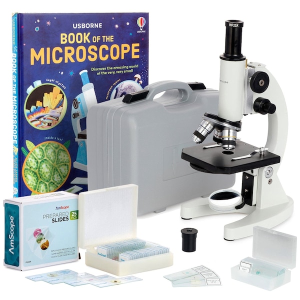 M60 Student Metal Compound Microscope 40x-1000x Magnification with ABS Case, 25pc Specimens & Book