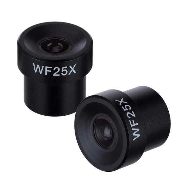 There are a pair of brand new WF25X microscope eyepieces. They are Achromatic (International DIN/JIS) standard size with outside diameter of 23 mm. Give your microscope a boost with greater power & clarity at a fraction of cost.